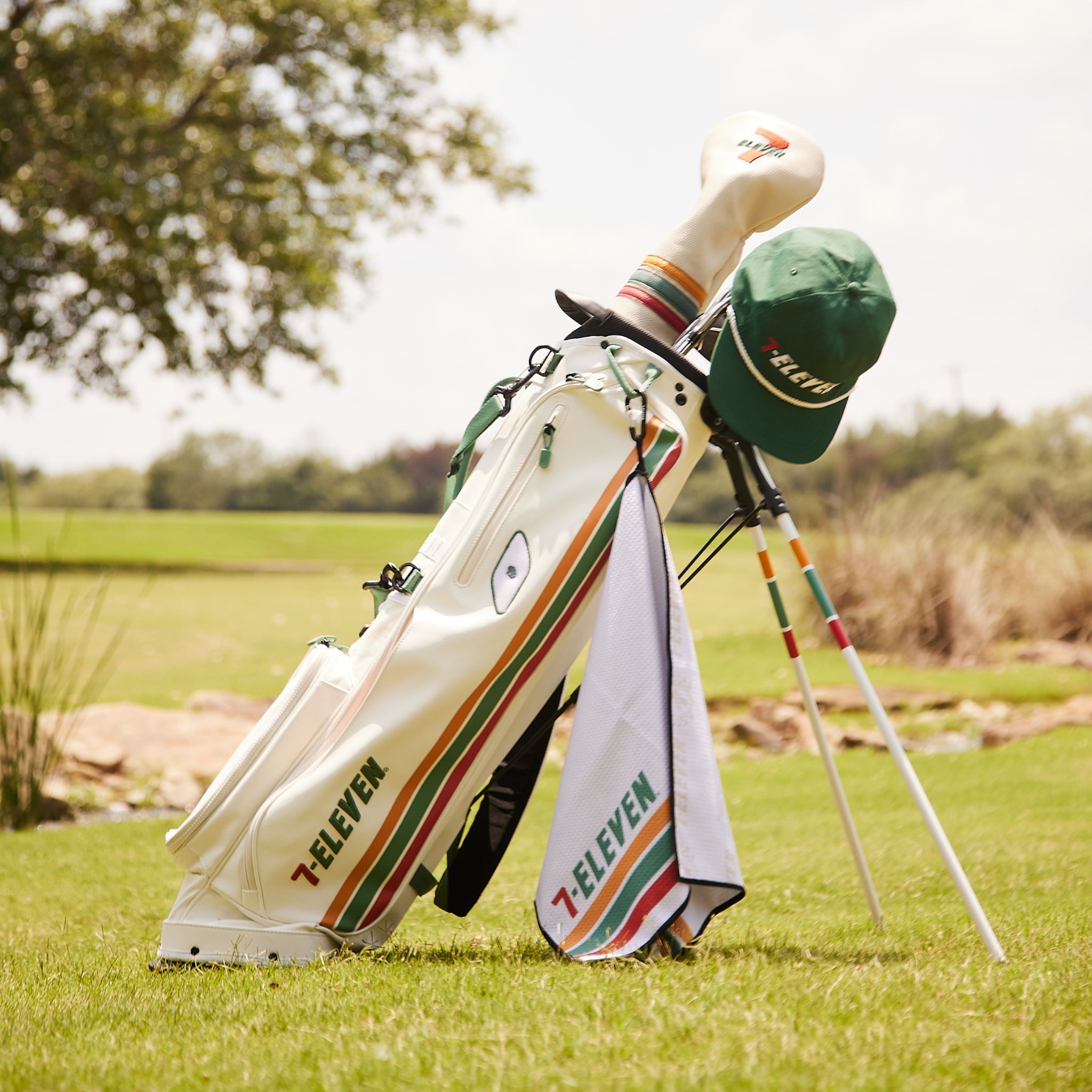 Meet your new caddy, the custom Sunday Golf Bag from 7-Eleven®. Lightweight, stylish, and ready to carry your clubs like a pro—because your golf game deserves more than a standard-issue duffer's bag.