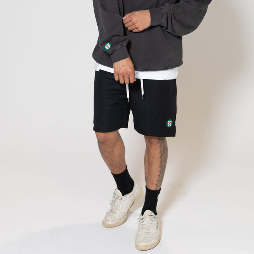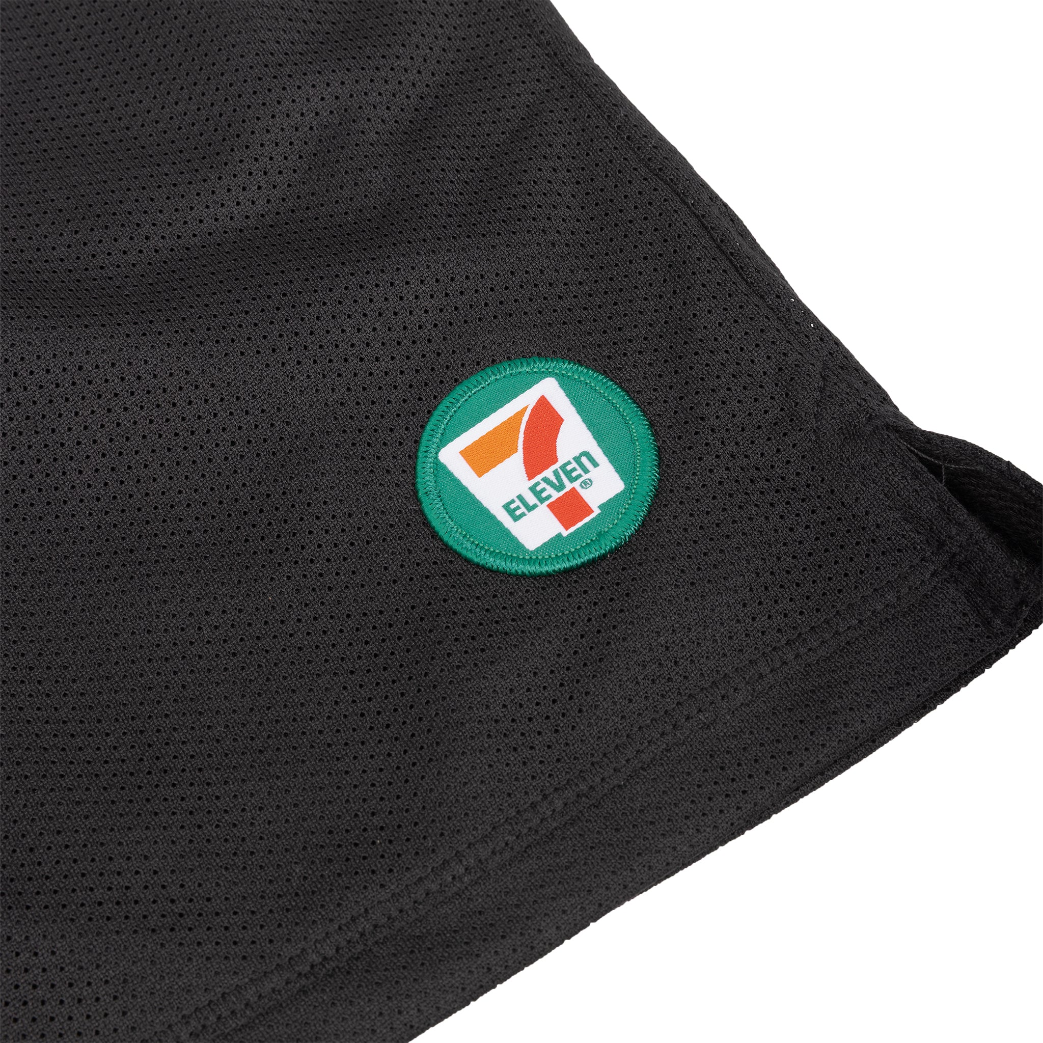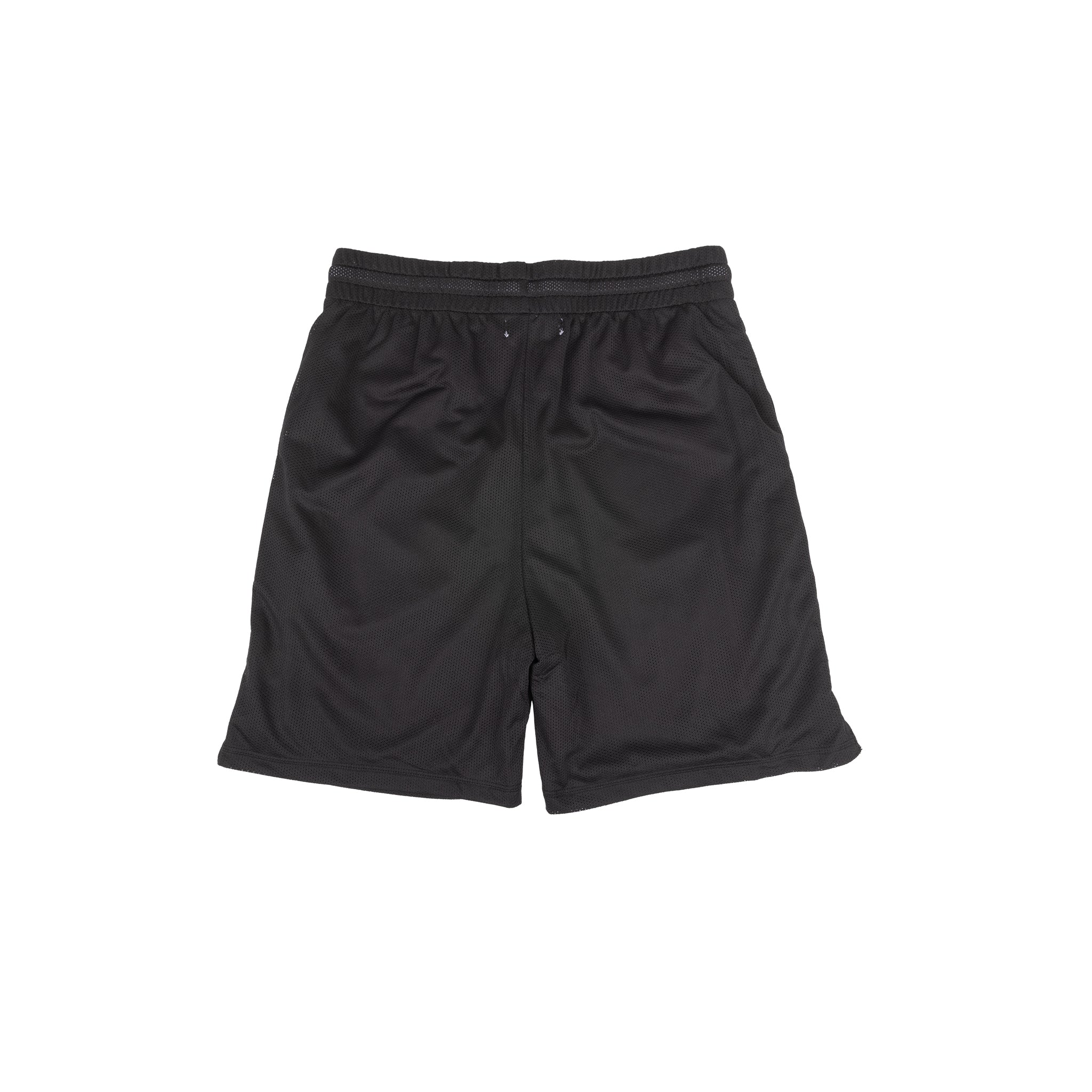 - Perforated double-layer fabric shorts, on-seam side pockets, side splits at hem, elastic waistband, white drawcord with metal tips