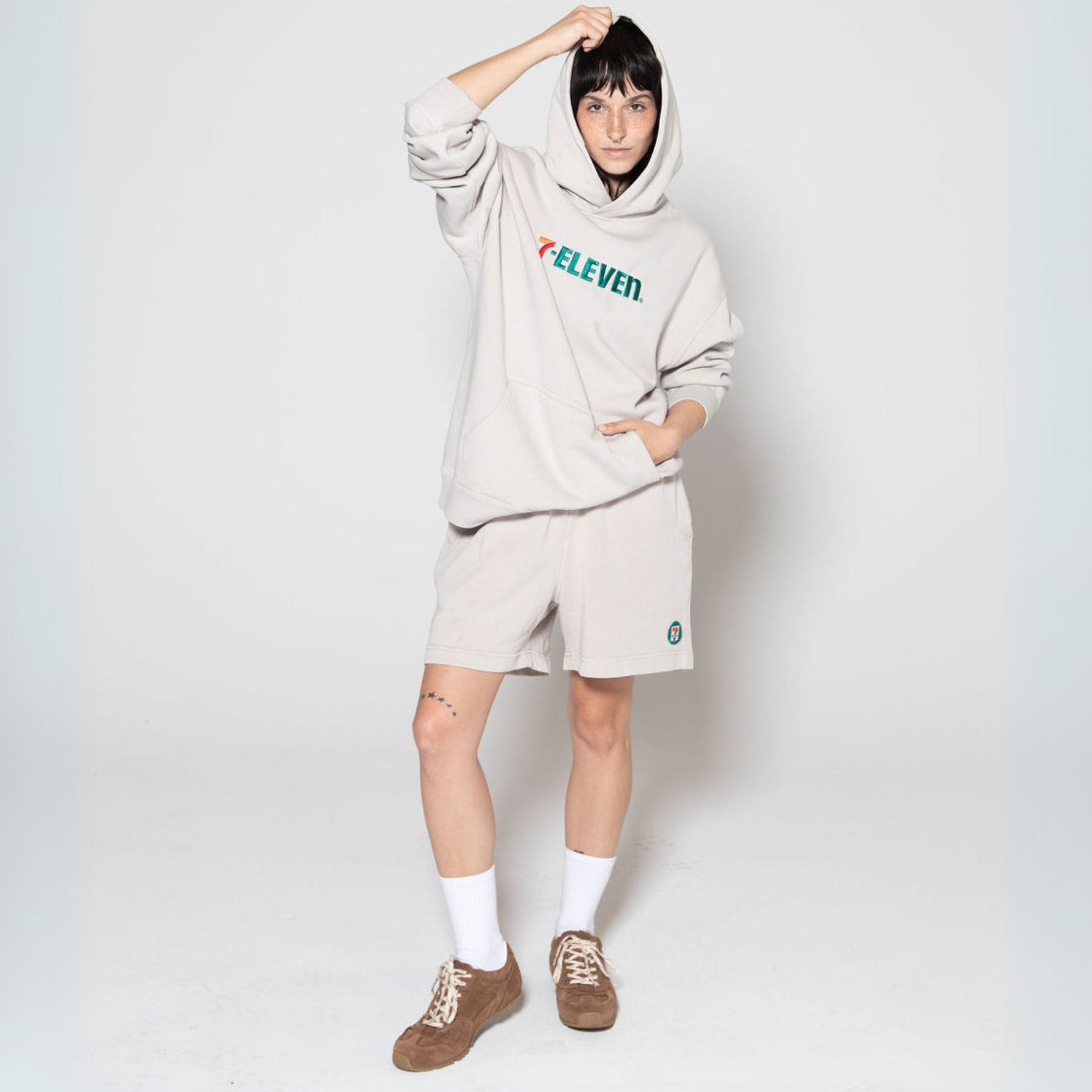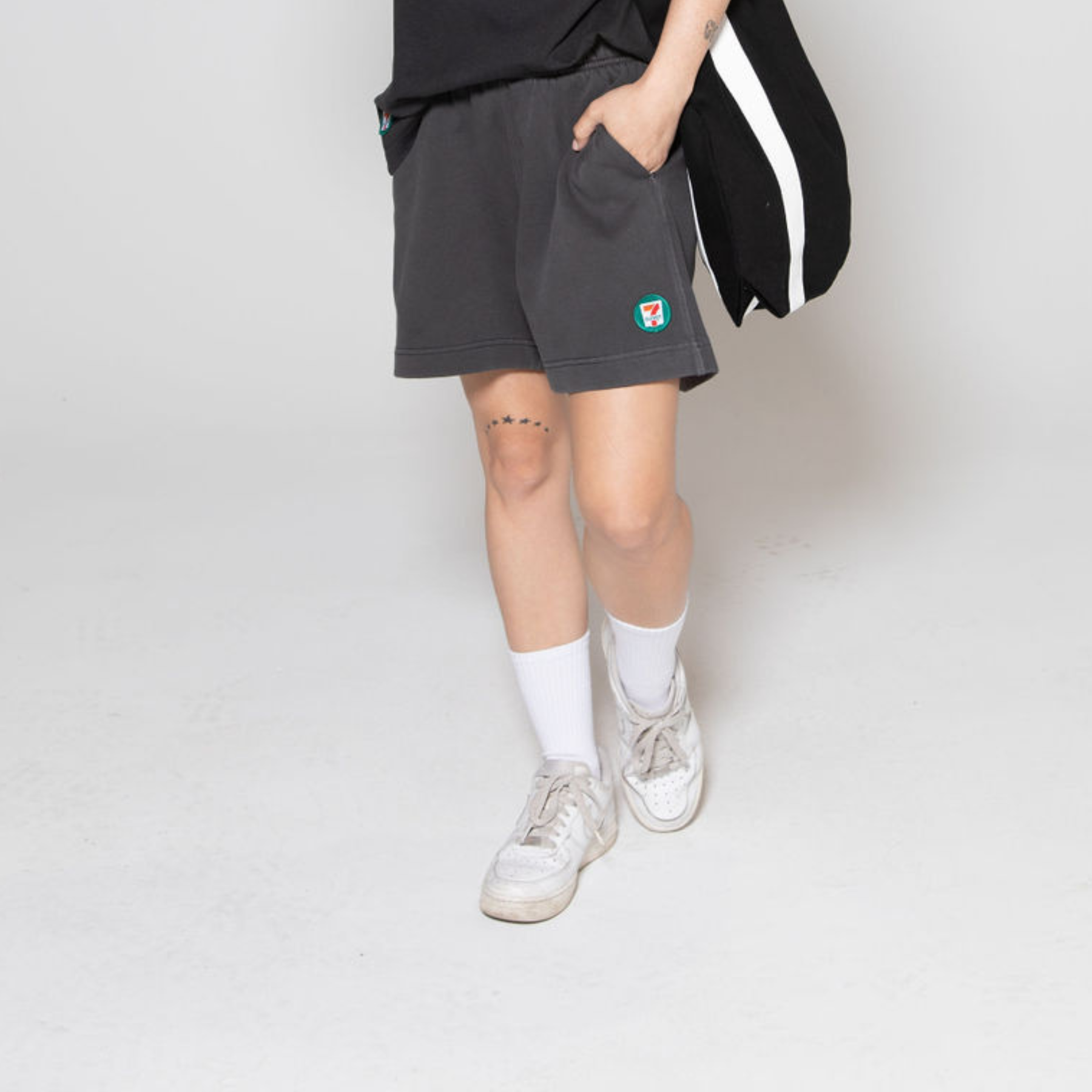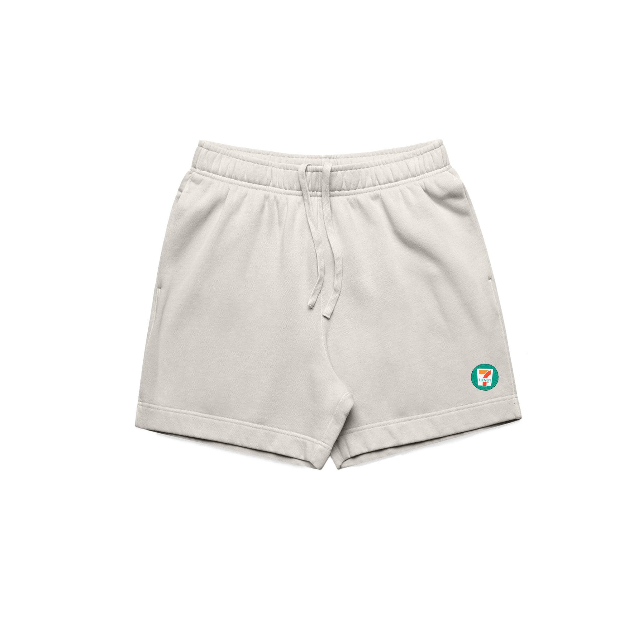 - Sweat shorts, self-fabric elasticated waistband, tonal internal drawcord, garment dyed, 2 side pockets, single pocket at back, double needle hems